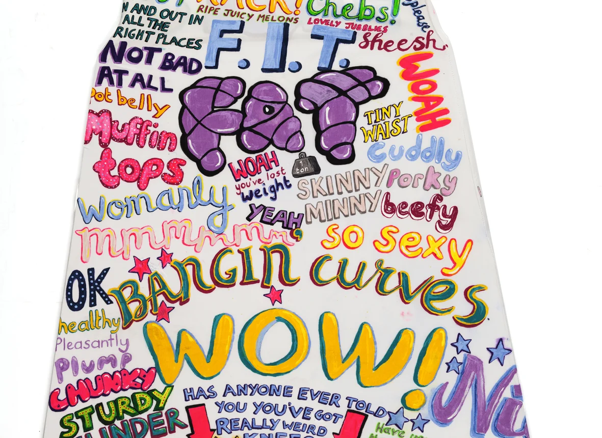 Before we get started on what on earth prompted me to paint a (slightly see-through, skintight) dress with all the things — good, bad and ugly — that people have said about my body during my 31 years of existence, I just want to get a few things straight. This piece isn't an attack on anybody. It's not a vanity project, or a pity party. I'm not trying to make people feel sorry for me just because somebody once told me I have thunder thighs, weird knees, sausage fingers and minging teeth. And I'm not looking for anyone to tell me that my arms really aren't that big and butch, or that my thighs aren't that chunky.
